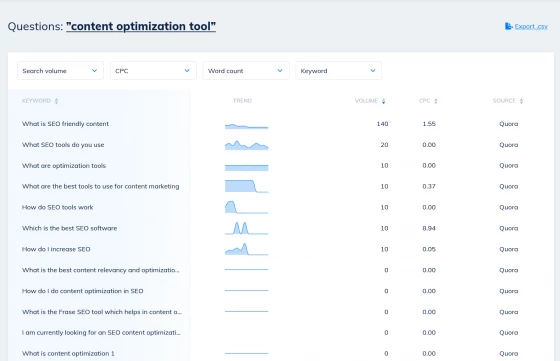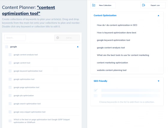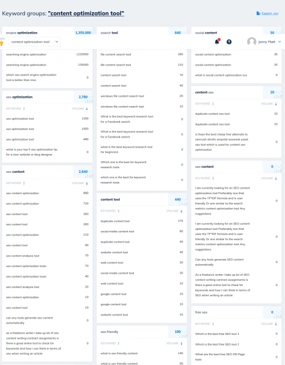 Drag, drop, reorder and edit your selections on a Trello-like board to quickly plan out supporting content for your topic clusters. Then hit Export to grab your content plan ready for emailing to your writers